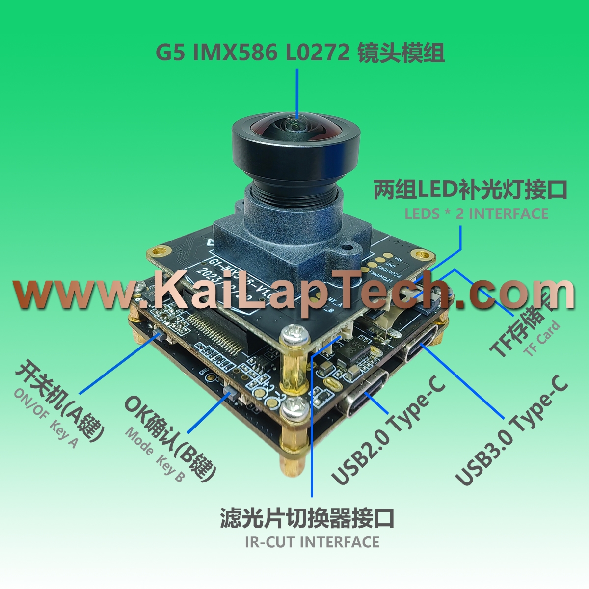 Equipped with iCatch V57, built-in 2GB DDR3, supports up to 4K@30FPS, 1080P@120FPS H.264 encoded video. Onboard support for Type-C, TF memory card, video recording, 2 control buttons, buzzer, battery power supply, etc.