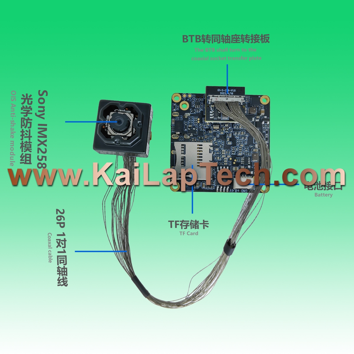 It uses an extremely fine coaxial cable to connect to the mainboard, which is convenient for various installation scenarios. Supports optical image stabilization image enhancement function. The board frame size is 17*17mm.